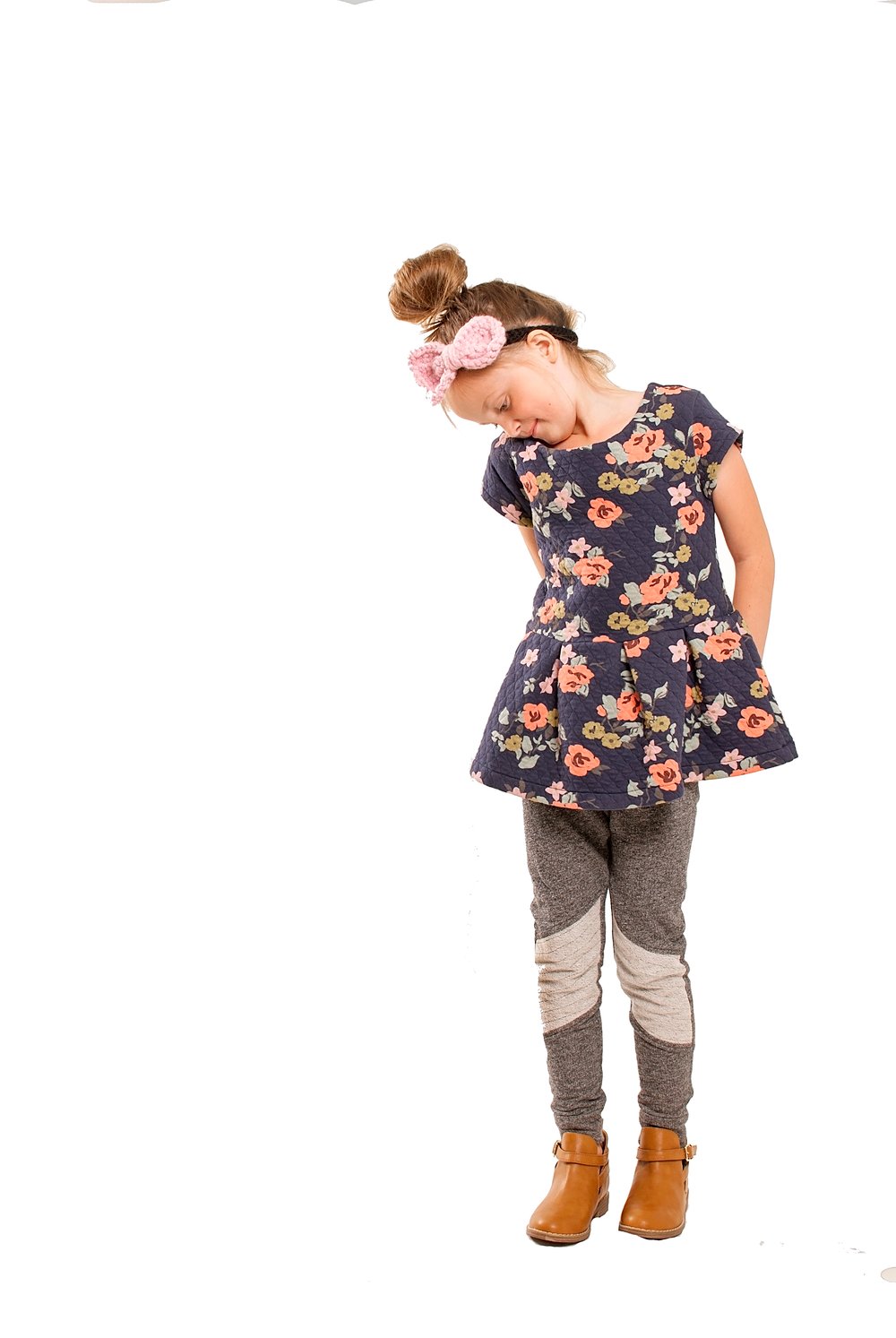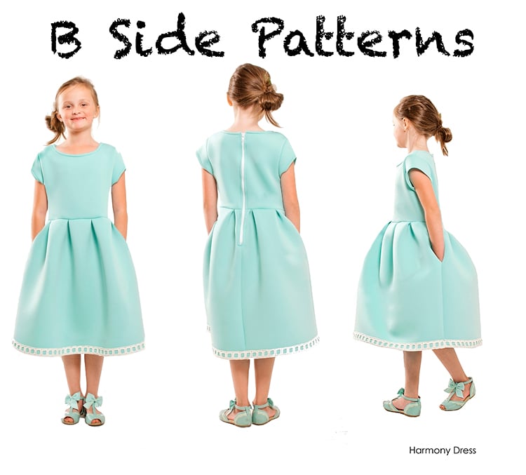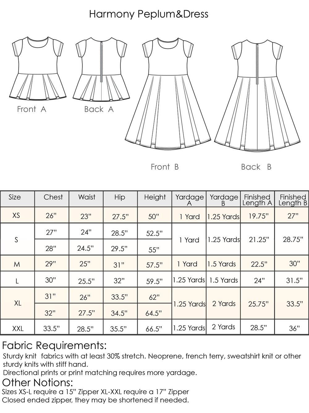 From B Side Patterns Vol. One, the Harmony Dress&Peplum Pattern is a knit fitted bodice with pleated skirt and exposed zipper down the back. Dress length has inseam pockets, and the peplum length is a great style for a feminine top, pair it with leggings, jeans or a skirt for different style options.