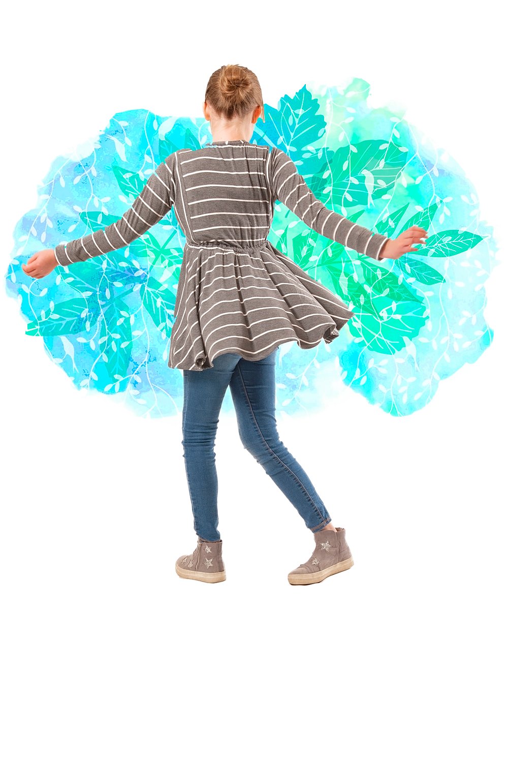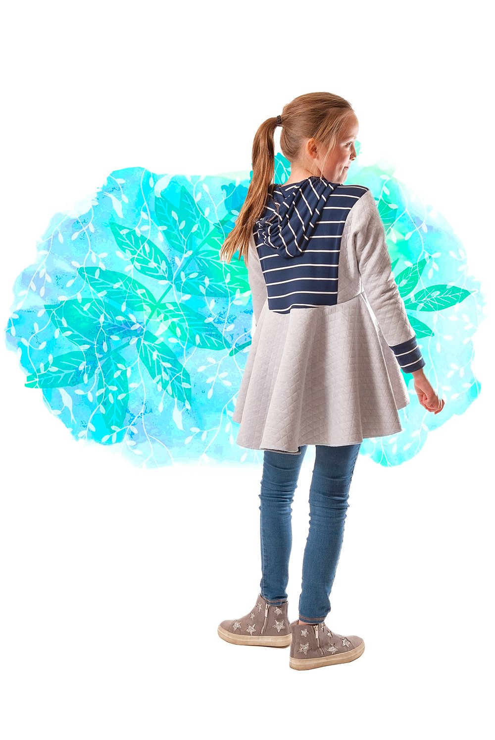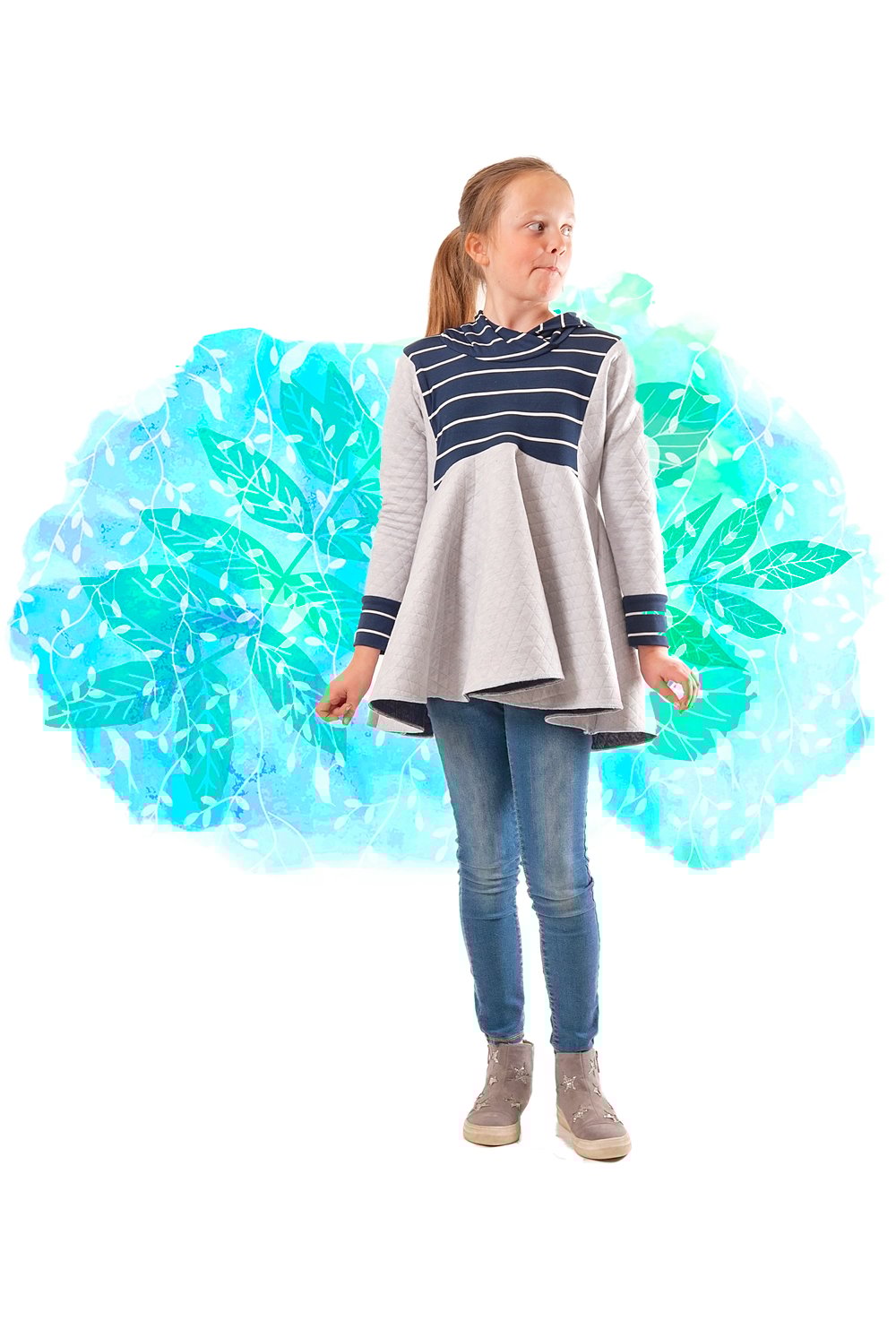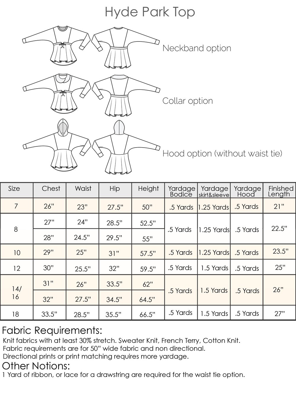 The Hyde Park Top is an empire waist top with a color blocked bodice, a high low hem line and circle skirt peplum. Many options include a hood, collar, or crew neckline, and an optional drawstring waistline.