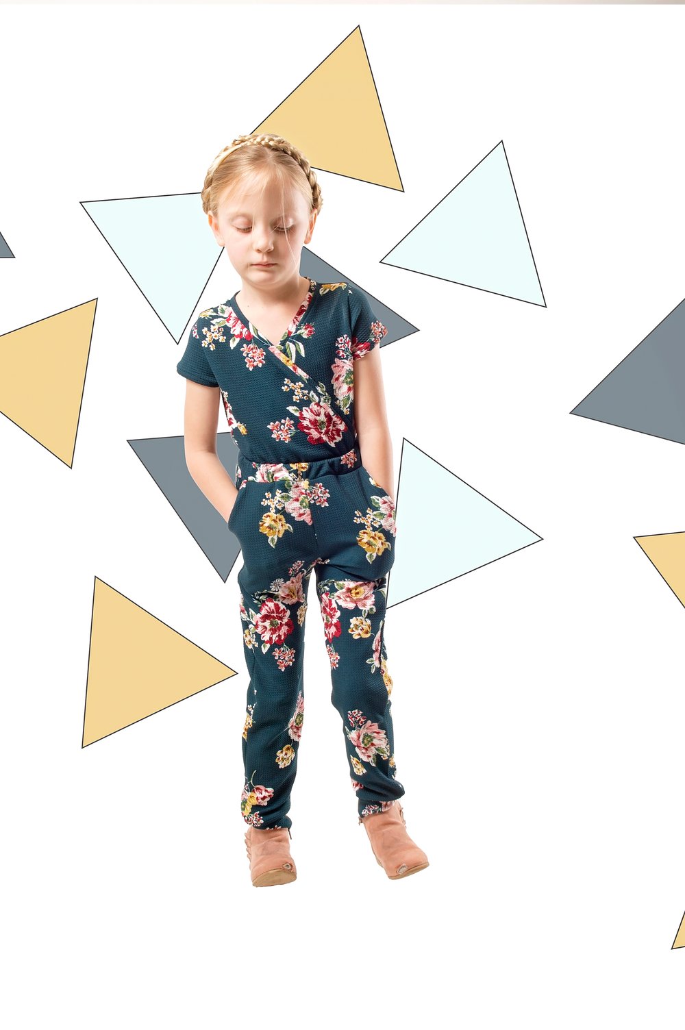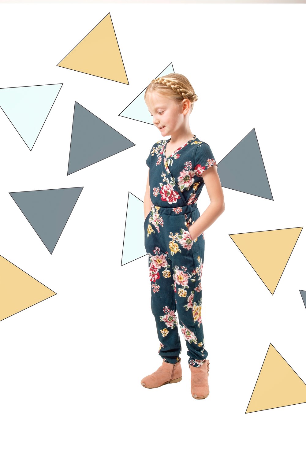The Joy Romper is a faux wrap top on top and joggers on the bottom. Comfort and style all wrapped up into one. The cross over front design makes dressing easy even for little ones (no tricky back buttons)