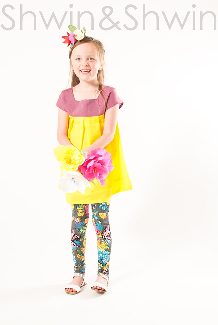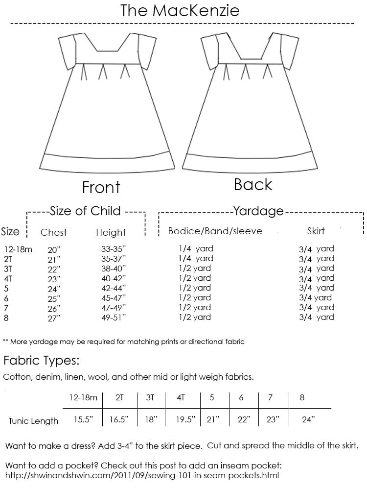 The McKenzie Tunic is a great square neck top with box pleated bodice and a full swinging bodice with contrast band. The back features a low neckline so the whole top fits easily on and off without any buttons or closures. Super quick and easy to make.