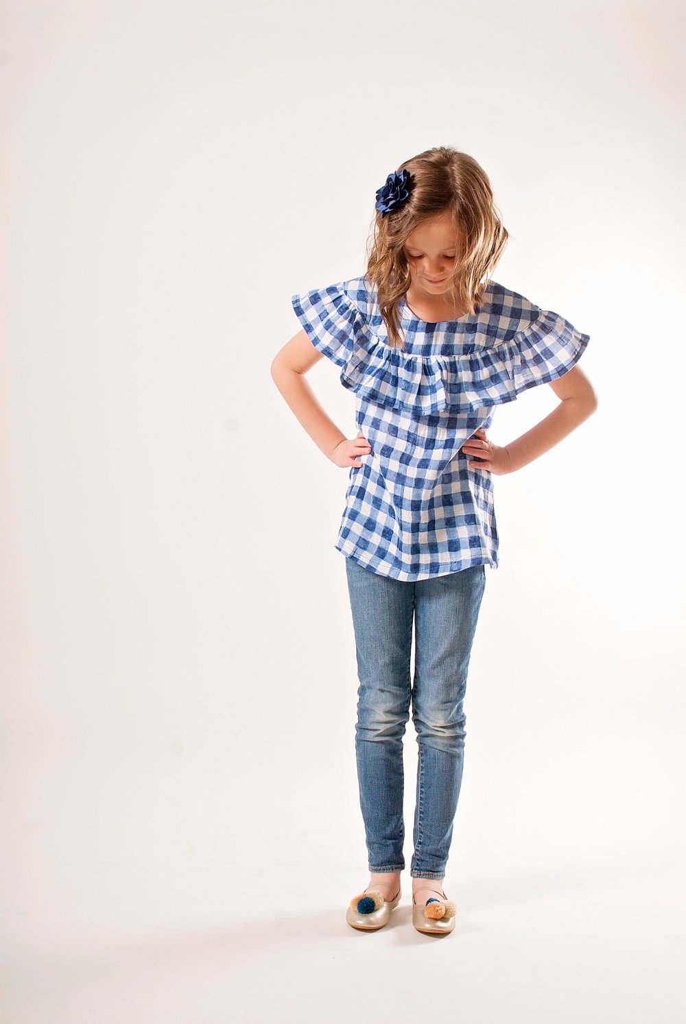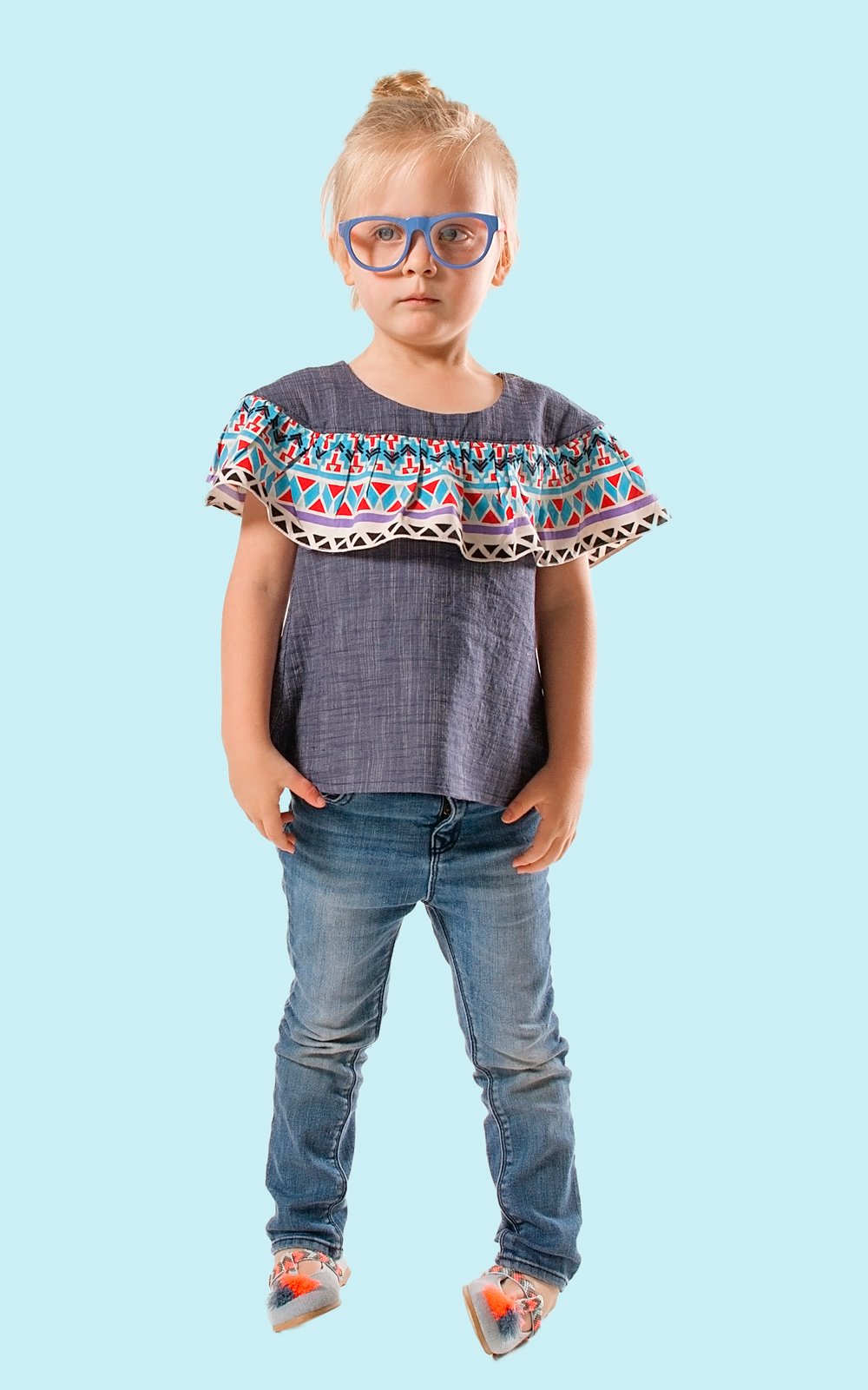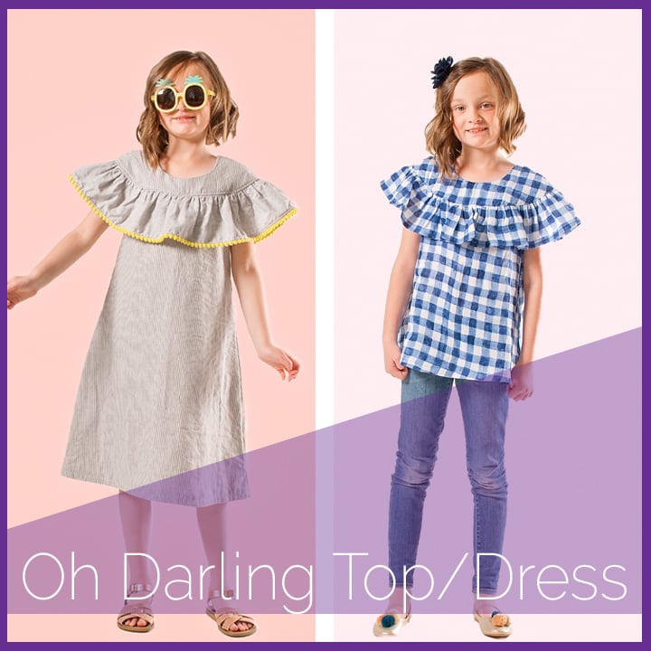 The Oh Darling Top and Dress pattern has a dropped shoulder bodice with a ruffle all around the shoulder. In a top or dress length with a zipper down the back. The perfect touch of a feminine ruffle.