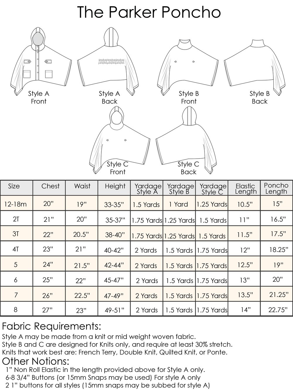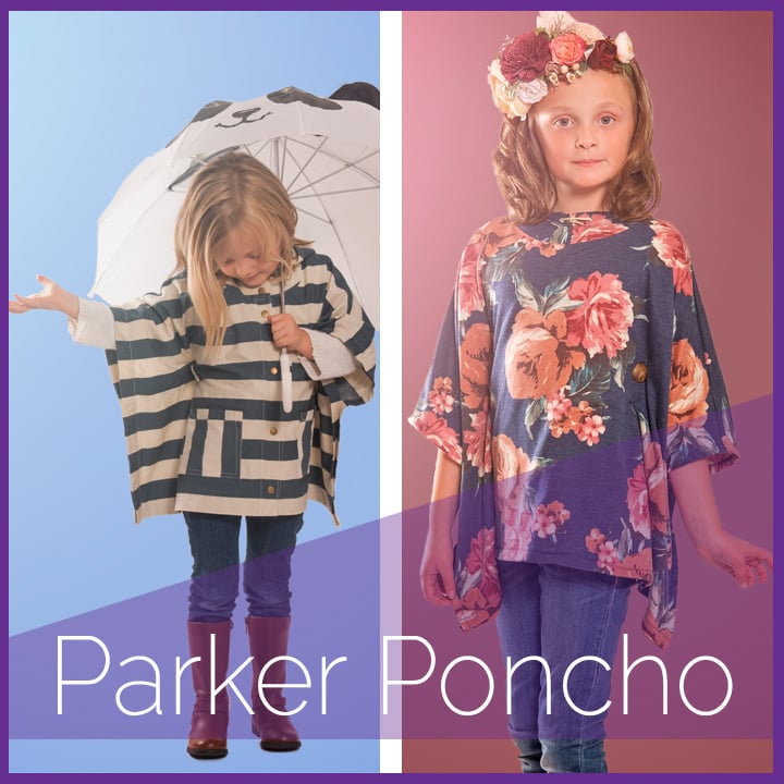 The Parker Poncho sewing pattern is a poncho style sweatshirt, top, or jacket. With an open front or over head style option, you can make it over and over for several different looks. Suitable for boys or girls the poncho offers many different styles and is a perfect layering piece for transitional weather.