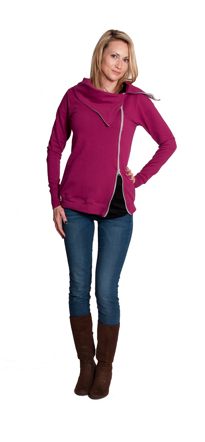 A Perfect and cozy sweatshirt with an edge. Asymmetric Zip front, and oversized collar. This slim fitting knit jacket is comfortable and stylish all wrapped into one.
