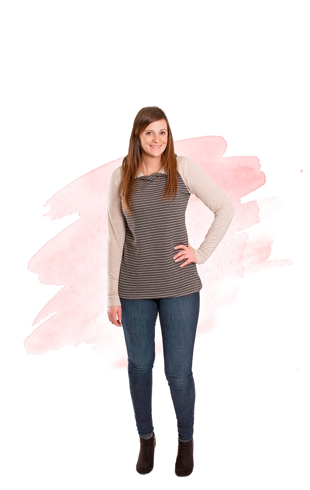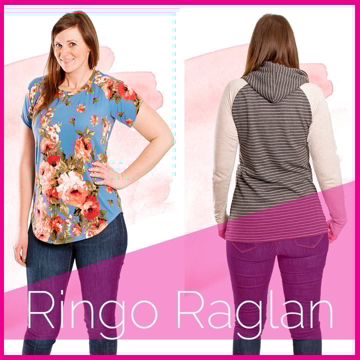 The Ringo Raglan sewing pattern has raglan style sleeves, and a number of style options. Choose from a crew neck, cowl neck, or hood option. Long and short sleeve options as well as 3 hem options. This makes the Ringo a great wardrobe staple.